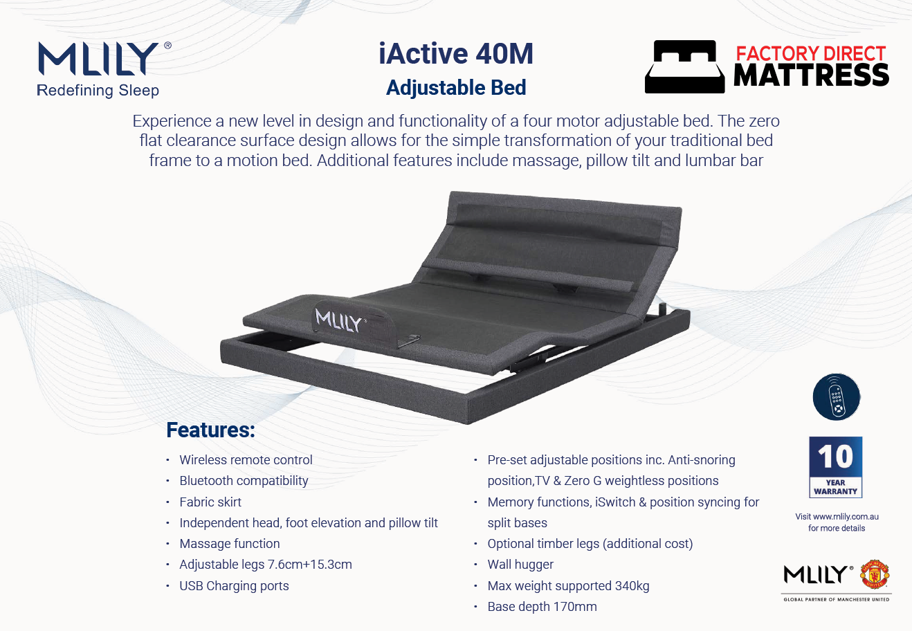 • Pre-set adjustable positions inc: Independent head and foot elevation, Anti-snoring position, TV view.